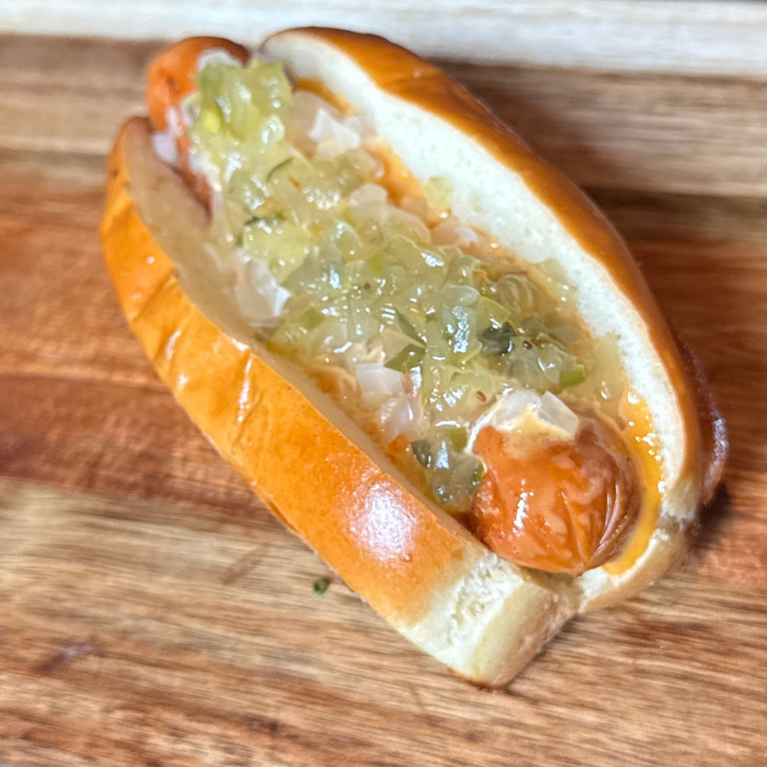 Veggie dog topped with tangy relish, crisp diced onions, and our signature Wiener sauce