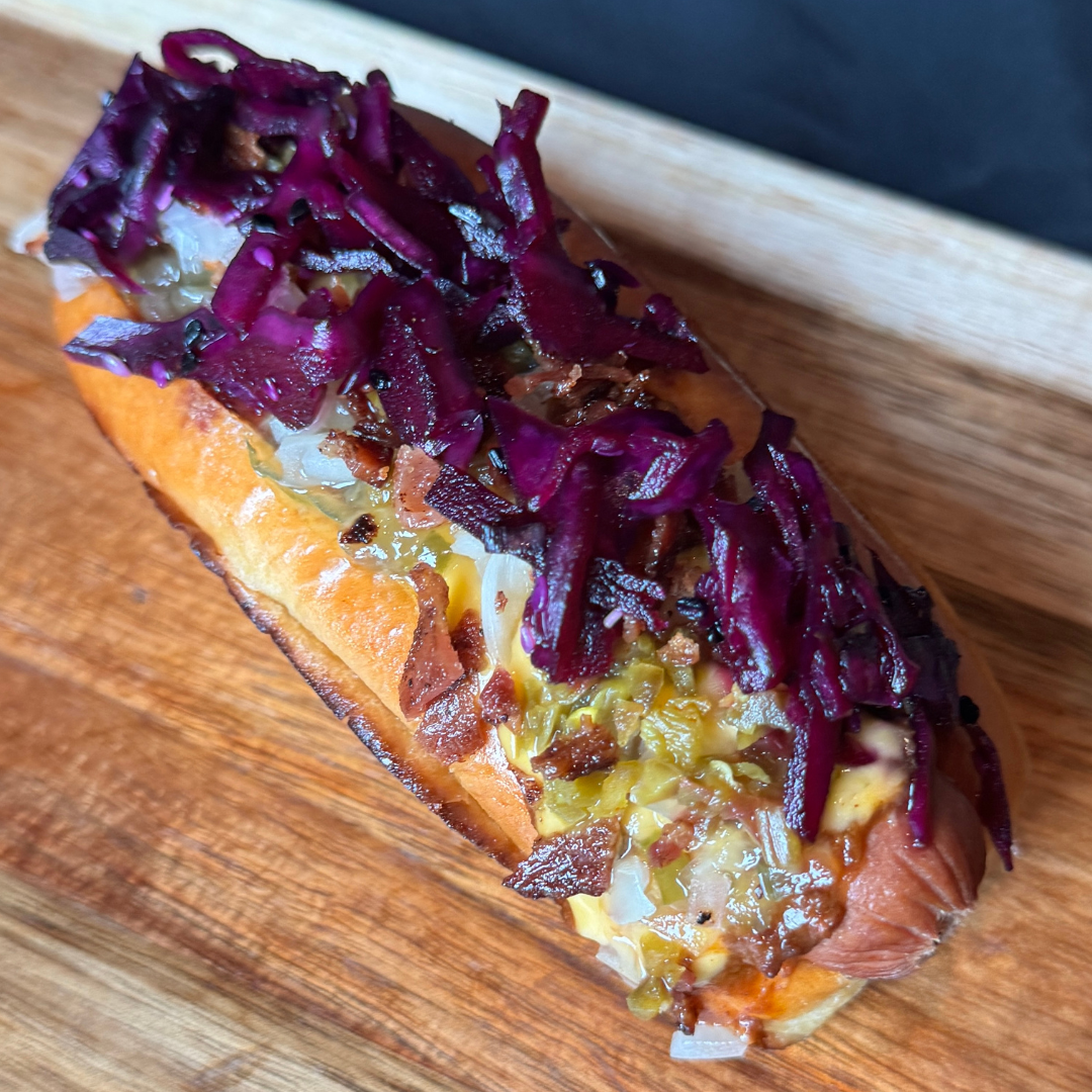 Fully loaded hot dog topped with chili, melted cheese, spicy jalapeños, fresh diced onions, slaw, bacon, and relish.