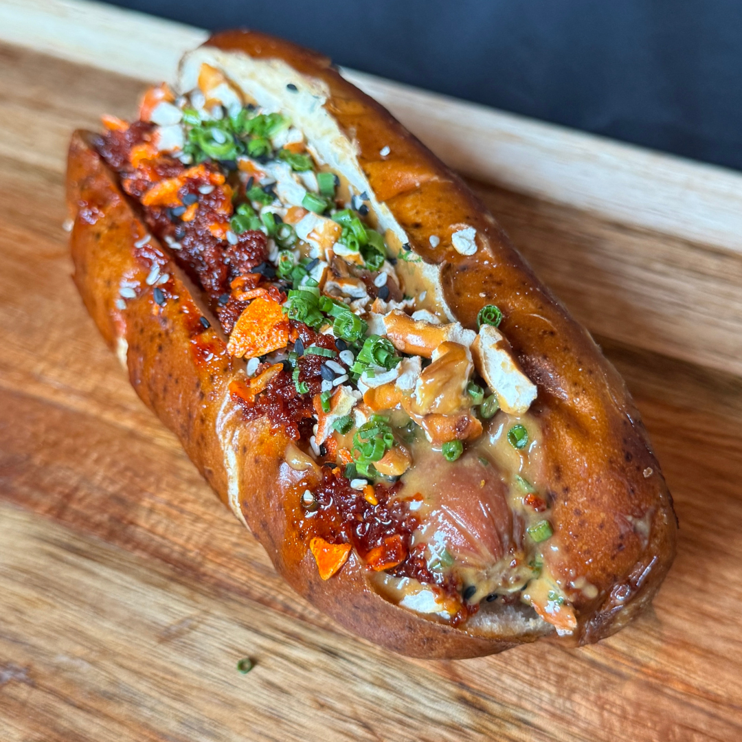 Hot dog layered with smooth peanut butter, crunchy pretzels, diced bacon, and a touch of garlic crunch on a pretzel bun.