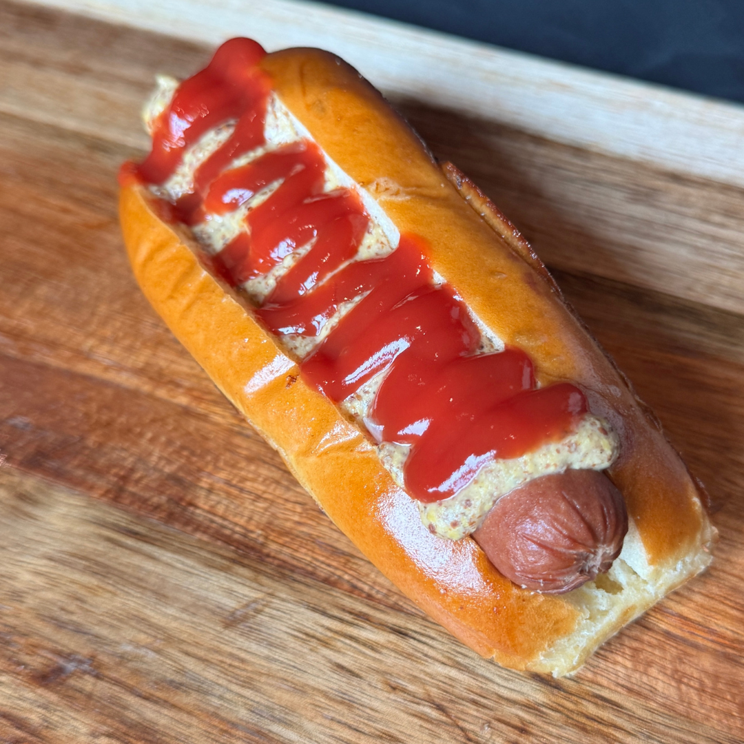 Traditional plain hot dog, served with ketchup and mustard.